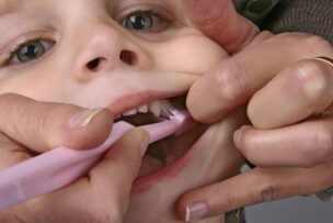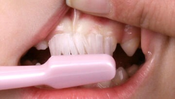 Abb. 2 Für durchbrechende Molaren kann eine abgewinkelte Einbüschelbürste hilfreich sein.
